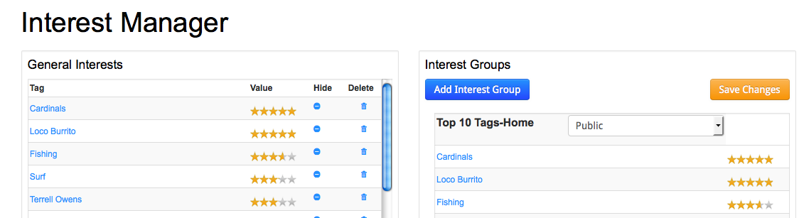 Interest Groups gives you greater control over your Megathread profile. Top 10 Tags are the default top Interests recognized over your site.