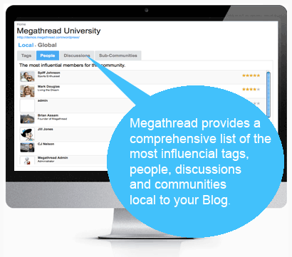 Megathread provides comprehensive semantic analytics that measure the social influence of key contributing factors that apply to your blog. This includes you and other editors, your commenting members, content, keywords, discussions, and other similar communities to your blog.