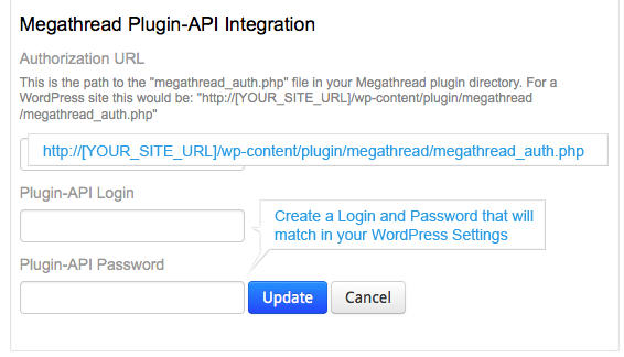 (Note: This is the path for the megathread_auth.php file in the plug-in directory you just installed. For WordPress this is going to be: http://[YOUR_SITE_URL]/wp-content/plugin/megathread/megathread_auth.php)