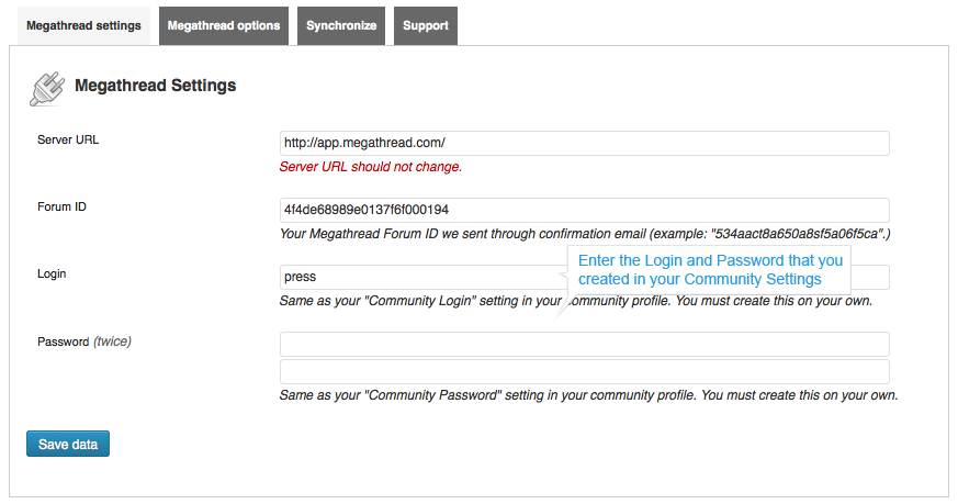 10) In your WordPress Dashboard go to Settings/Megathread (see below) and under Megathread Settings paste your Forum ID (copy it from the second email we sent you from step 2) along with the Plugin-API Login and Plugin-API Password you created in your Community Settings (step 9) and be sure to “Save” your changes.
